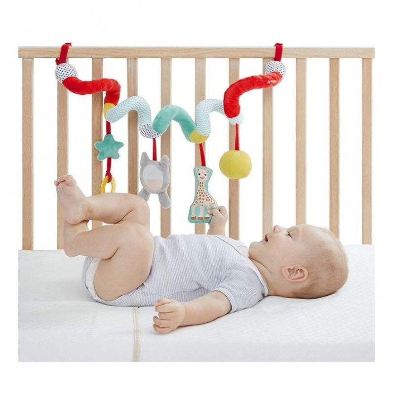 Sophie La Girafe Espiral de Atividades estica e enrola-se à volta da barra de segurança do carrinho ou nas grades do berço. É fácil de ajustar graças aos velcros que se encontram na extremidade.
