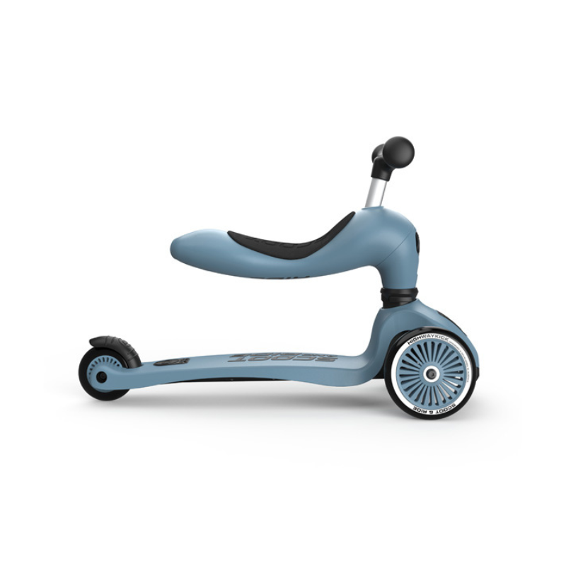 O Highwaykick 1 é uma trotinete 2 em 1 que se transforma facilmente de modelo com assento em kickboard, sem ferramentas. Ideal para crianças dos 1 aos 5 anos, é ajustável em altura, seguro e estimula o equilíbrio e a coordenação motora.