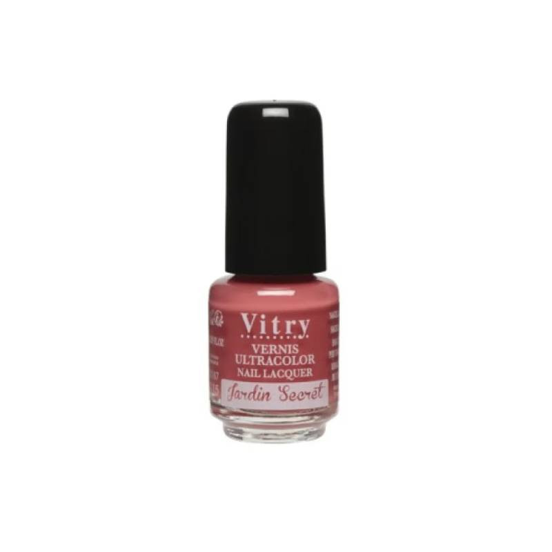 Vitry Mini Verniz 115 Jardin Secret 4ml é um verniz com um tom rosa para fixação e brilho extremos, perfeito para as unhas mais frágeis.