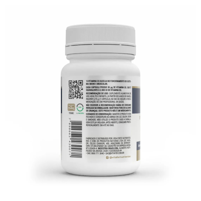 Vitamina D3 50 µg (2000 UI) por cápsula. Para ossos, dentes, imunidade e músculos.